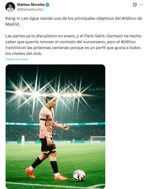 « Kang-in Lee demeure l’une des priorités de l’Atlético de Madrid. Les deux clubs ont déjà abordé le sujet en janvier, et le Paris Saint-Germain a manifesté son désir de prolonger le contrat du Sud-Coréen. Cependant, l’Atlético continuera de le courtiser dans les semaines à venir, car il s’agit d’un joueur qui plaît à tout le club. »