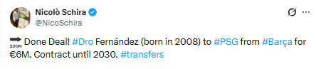 Affaire bouclée ! Dro Fernandez (né en 2008) au PSG depuis le Barça pour 6 millions d’euros. Contrat jusqu’en 2030. »