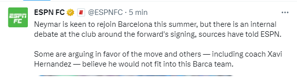 Plusieurs médias étrangers évoquent donc aussi ce dossier, sans que ce soit assez pour en faire quelque chose fiable. Il y a le sentiment, puisque l’on a déjà vu cela pour un démenti au bout, que toute la presse veut sauter sur l’occasion de cette rumeur afin de se faire remarquer. Pour le moment, il n’y a toujours rien de concret ou d’officiel. Le dernier point dans ce sens était une prise de parole de Neymar affirmant qu’il va rester. On sait que cela peut changer, mais c’est au moins aussi crédible que cette nouvelle vague.