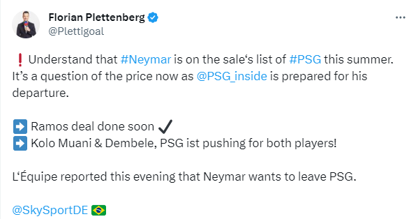 Neymar, attaquant de 31 ans du Paris Saint-Germain (contrat jusqu’en 2027) et du Brésil, a été plusieurs fois cité dans les rumeurs depuis l’été dernier sans jamais sembler s’approcher d’un départ puisqu’il voulait rester. Et c’est de retour pour ce mercato estival 2023. Ce lundi, L’Equipe a assuré que le Brésilien a indiqué au PSG qu’il souhaite partir et revenir au FC Barcelone. Plusieurs médias enchaînent ensuite. Sky Sport, le journaliste Florian Plettenberg et ESPN évoquent également une volonté de départ, avec un PSG qui serait prêt à ouvrir la porte. Mais il faut le bon prix et la position du Barça reste incertaine.